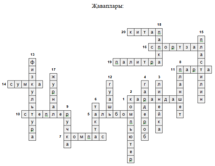Горизонталь буенча 1.Ак кәгазьдә эз сала, Туганнарга хат яза. 5. Андагы рәсемнәрдән Күргәзмәләр ясарлык. 7. Сөйләп бирә тел белән, Сүзе китә юл белән. 10. Кәгазь битләрен бергә тоташтыручы предмет. 11. Аның артында дөрес һәм төз утырырга кирәк. 14. Үзе минем дустым ул, Гел аркамда йөри ул. 16. Анда йөгерергә, сикерергә дә кирәк, Кәҗә, атлар, турниклар Булмаганы бик сирәк. 19. Төсләрне кушу, яңа төсләр ясау өчен кирәк. 20. _______- белем чишмәсе. |